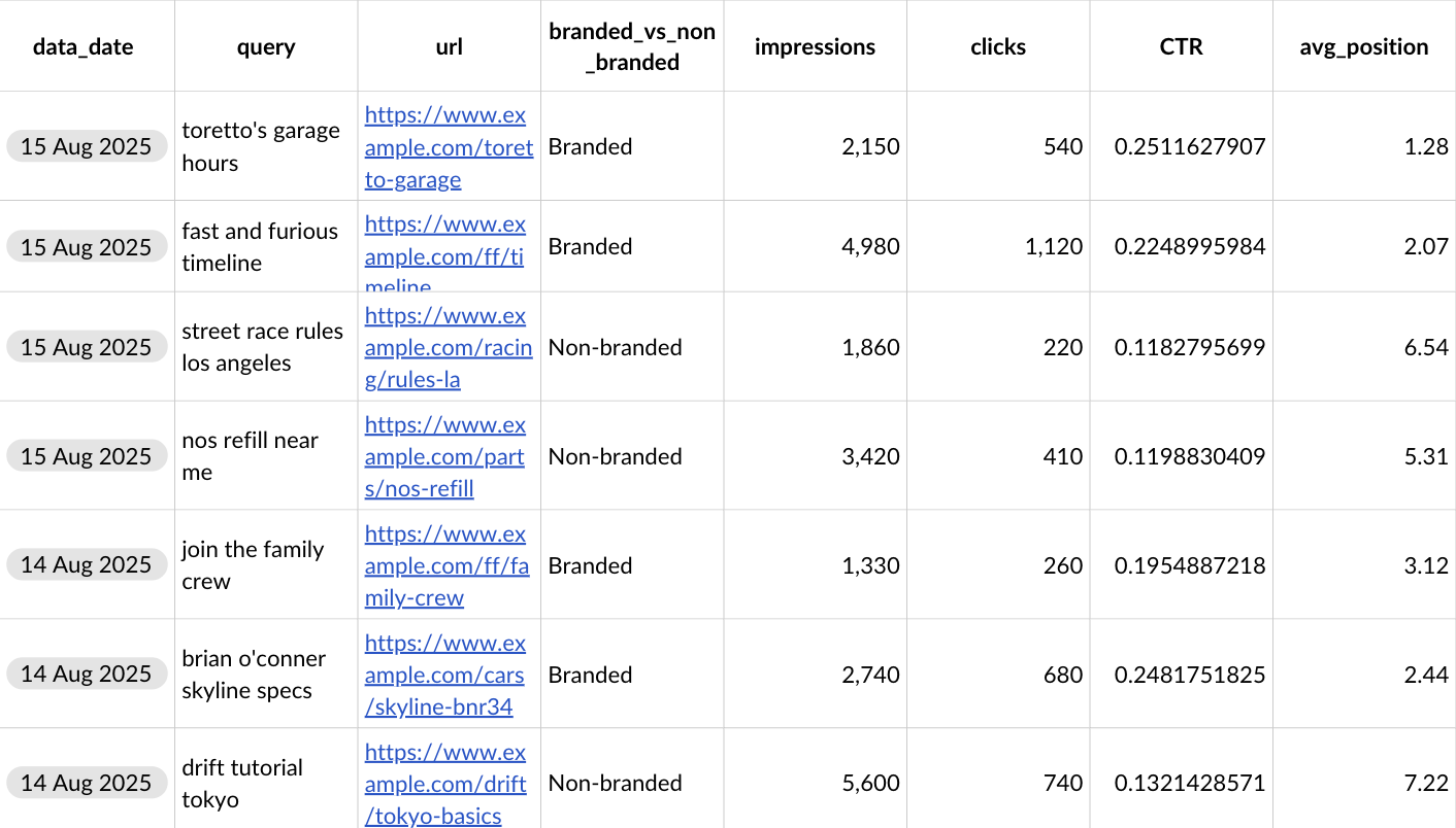Google lets you export your raw data from Google Search Console to BigQuery. This is exciting, as it opens up a world of possibilities for you to dive deeper into your search analysis and combine search data with other data points. This article shows some ways it can be used. And since I'm a huge Fast and Furious Fan, I'm using dummy FF data as my sample.